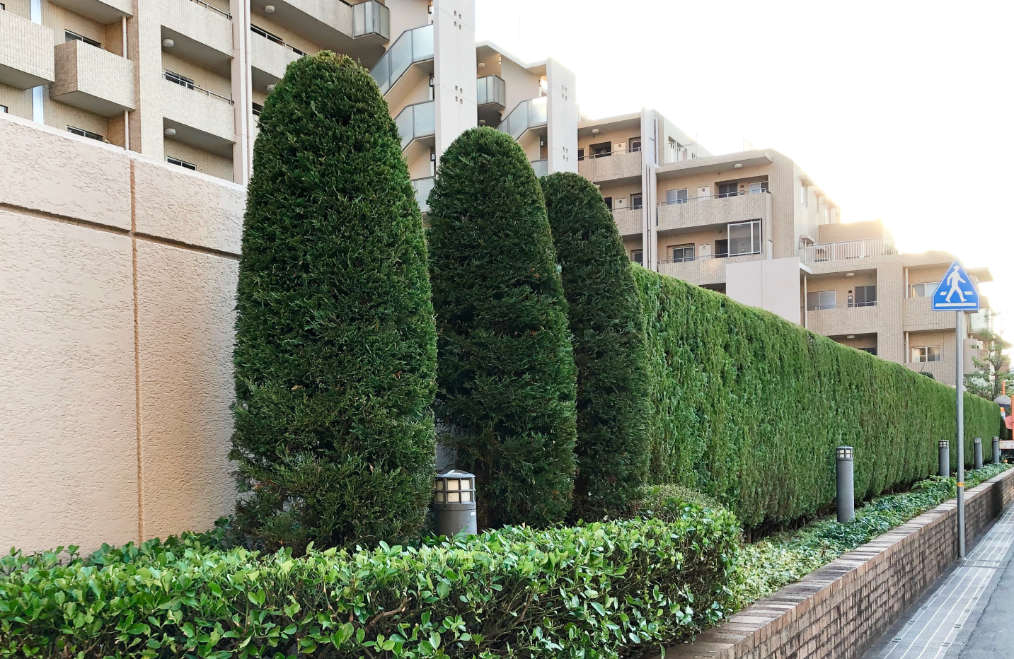 兵庫県伊丹市 マンション 樹⽊剪定管理 レイランディー、カイズカイブキ(貝塚伊吹)の生垣、マサキ(柾)
