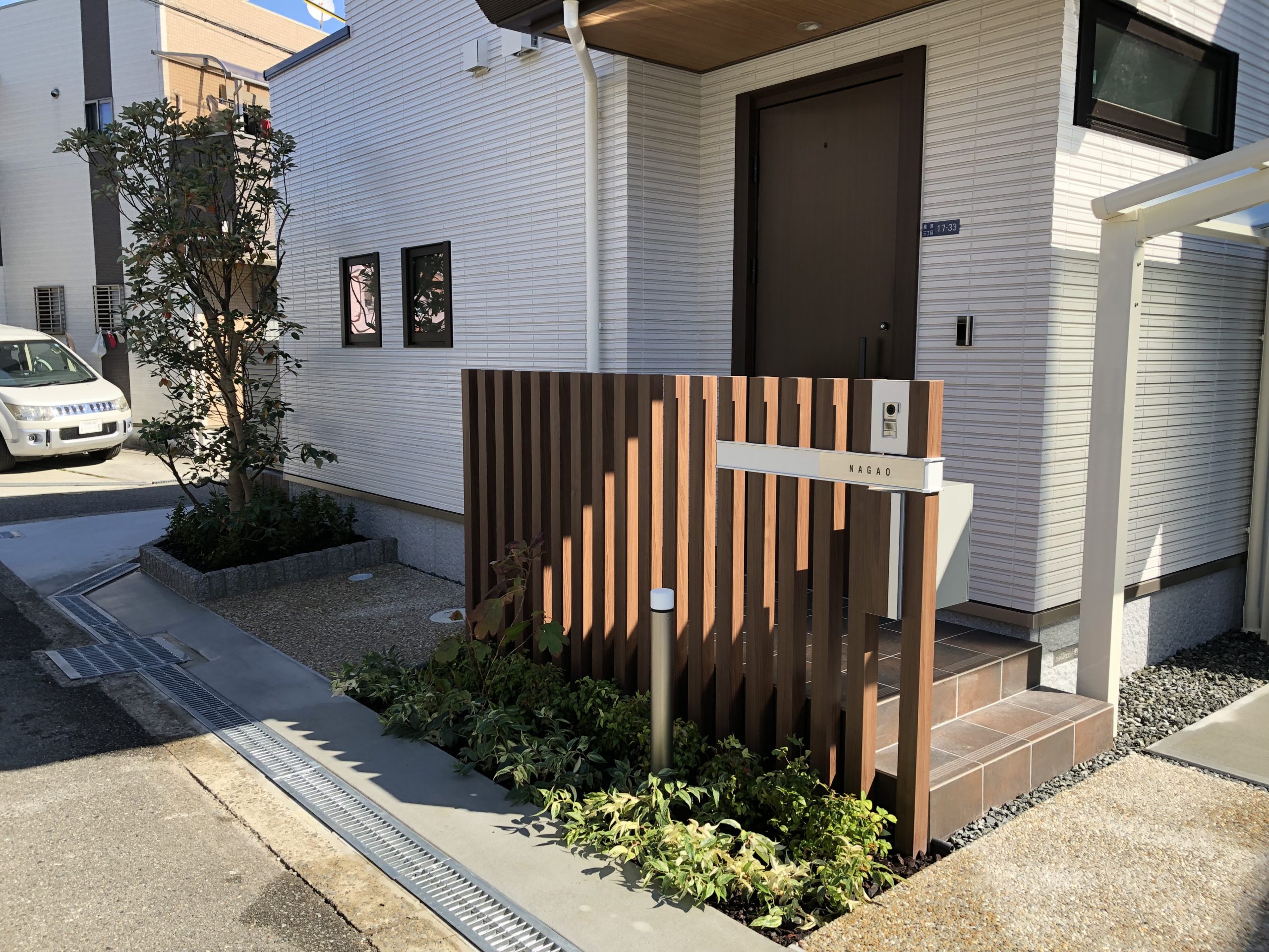大阪府⼤阪市 N邸 植栽スペース外構工事、シンボルツリーの植栽、他 シンボルツリー高木:ロドレイア、低木:ビバーナムティヌス