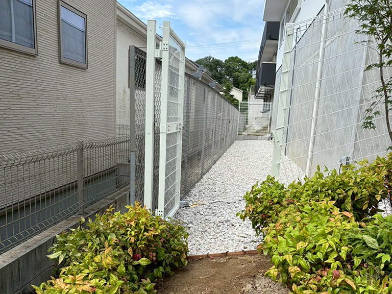 施工後は「チップアイボリー」の砂利を全面に敷き詰め、明るく清潔感のある仕上がりに整えました。