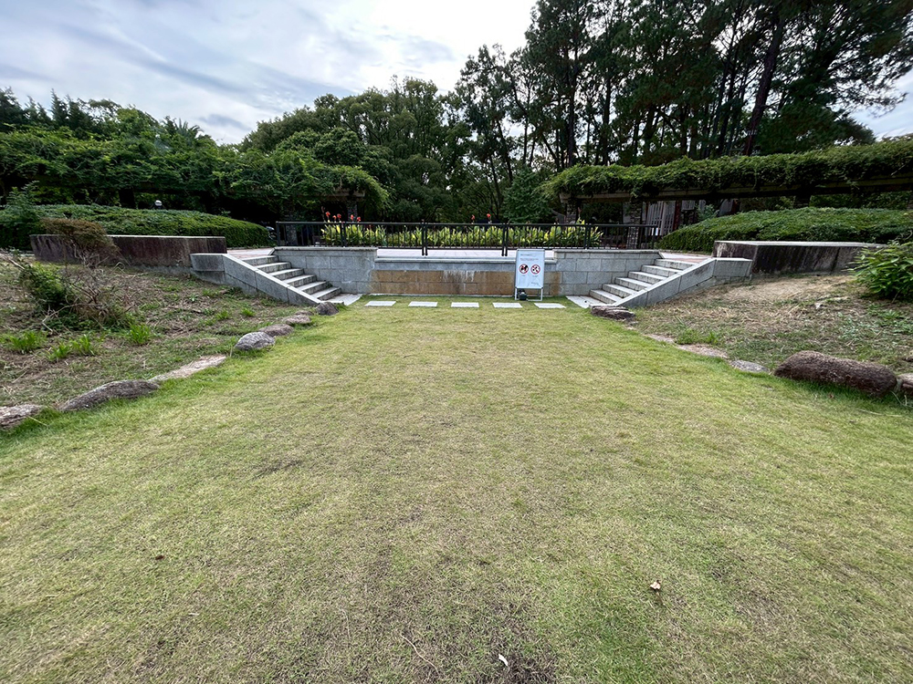 ステージから芝生の広場。ステージは弊社工事する前は噴水があり、ここにも水が流れてきていました。