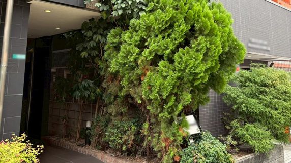 大阪府大阪市浪速区 マンション エントランスの植え込みの植物の剪定(ハナミズキ、コノテヒバなど)