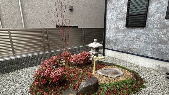 大阪府大阪市阿倍野区 個人邸 注文住宅の和風庭園 手水鉢のある築山