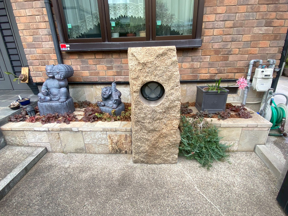 花壇の左側には、お客様がご用意された村秀鬼瓦工房の鬼の置物を配置。