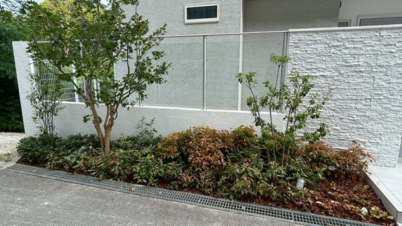 外構工事 大阪府⼤阪市 N邸 植栽スペース外構工事、シンボルツリーの植栽、他 シンボルツリー高木:ロドレイア、低木:ビバーナムティヌス